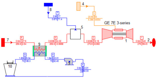 Figure 9 shows a schematic of the turbine and inlet cooling system presented in Thermoflex for a gas turbine with hybrid absorption refrigeration evaporative inlet cooling (Figure 4). The surrounding ambient air (7) is precooled from state 6 to state 5 in the heat exchanger (6). The air cooling is completed from state 5 to state 2, as it is humidified in the evaporative cooler (5) using a water source (8). The absorption chiller (3) cools the water needed for the heat exchanger (6). The generator of the absorption chiller (3) was assumed to operate using a hot water source (12) of 100 °C, which will be heated using gas turbine exhaust gases. The design absorption coefficient of the chiller’s performance was assumed as 0.67. The maximum temperature rise in the chilled water in the heat exchanger (6) was assumed as 7 °C. This hot water is heated using gas turbine exhaust gases. The condenser of the absorption chiller (3) is water-cooled using a cooling tower (10).