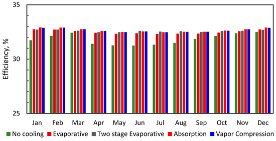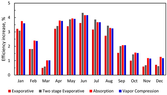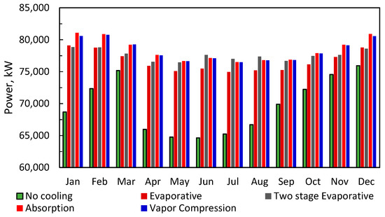 The simulation of the above cases was conducted for the GE 7001EA gas turbine in Riyadh. Figure 11 shows the net output power of the gas turbine with and without different inlet cooling techniques. The results indicate that the turbine power, ISO-rated 84 MW, fluctuates between 64.6 MW in June and 75.9 MW in December. For evaporative inlet cooling, the turbine power fluctuates between 74.5 and 78.8 MW. For two-stage evaporative inlet cooling, the turbine power fluctuates between 76.5 and 78.8 MW. For hybrid absorption evaporative inlet cooling, the turbine power fluctuates between 76.5 and 81 MW. For hybrid vapor-compression evaporative inlet cooling, the turbine power fluctuates between 76.5 and 80.6 MW. Figure 12 shows the monthly percentage increase in the turbine’s net power output for the different cooling techniques, referenced to the turbine without inlet cooling. The data in Figure 12 show that the augmentation in the turbine’s output can reach 20% in the summer. The two-stage evaporative inlet cooling system (Figure 12) performs better in June, July and August than the other techniques. Figure 13 shows the annual added electric energy owing to inlet cooling, compared with the uncooled turbine.