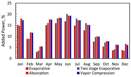 The current tariff of electricity in Saudi Arabia is Tae = 0.048 $/kWh [32]. The added annual cost because of using inlet cooling systems was estimated from