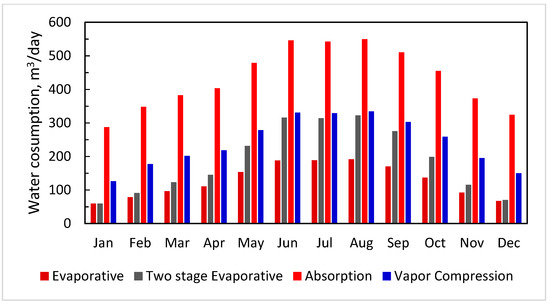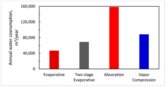 Annual water consumption of different inlet cooling systems.