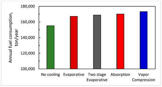 Annual fuel consumption of different inlet cooling systems.