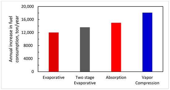 Figure 19 shows that the fuel consumption of the gas turbine with inlet cooling systems increases, compared with the gas turbine without a cooling system. The increase in fuel consumption is related to the increase in the compressor airflow rate owing to inlet cooling. Figure 20 shows the annual increase in fuel consumption.