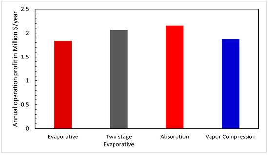 C is a conversion factor, mw is the total water consumption and Pw is the water price (Pw = 1.6 USD/m3) [34]. Figure 21 shows the added annual operating profit (AAP) produced using inlet cooling systems. The average AAP is USD 2 million per year. The evaporative and hybrid vapor-compression inlet cooling systems produced AAP of 9% and 7.5% less than the average AAP, respectively. However, the two-stage evaporative and hybrid absorption inlet cooling systems produced AAP of 3% and 6.5% higher than the average AAP, respectively.