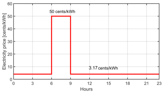 - Cost function using rate flex M: the second optimization problem in consideration is shown in Equation (4), where the objective is the minimization of the variable electricity cost shown in Figure 8. Equation (4) is a special case of Equation (3) but has an added variable energy cost over the day, indicated by subindex i, with higher cost during peak hours (Table 2).where N is the number of time steps over the prediction horizon (24, 36, 48 h, etc.), is the power demand at time i, and is the time step. The objective is to identify two variables that minimize the cost associated with the utility rate charge: (1) an optimized setpoint schedule for the room temperature and (2) the maximum charging power input to the ETS, . The setpoint is constrained by a lower () and upper () bound to maintain a level of thermal comfort for the zone occupants. The demand due to space heating P is constrained by the size of the heating equipment . Similarly, the maximum charging power input to the ETS is constrained by the specifications of the device, . Prediction control simulations are run at 5-minute intervals for higher time granularity and optimized values are identified at 1-hour intervals to speed up schedule identification.
