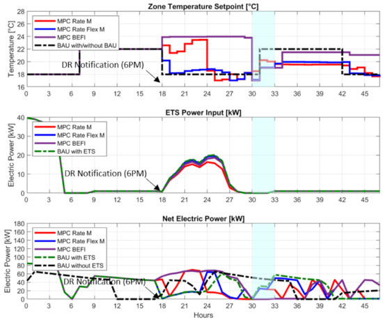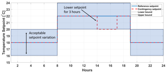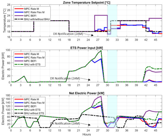 - Contingency strategies were evaluated to quantify the energy flexibility available from the building to the grid at specific times. Two strategies were evaluated: (1) reducing the zone temperature setpoint for 3 h and (2) discharging the stored thermal energy in the ETS for 3 h.
