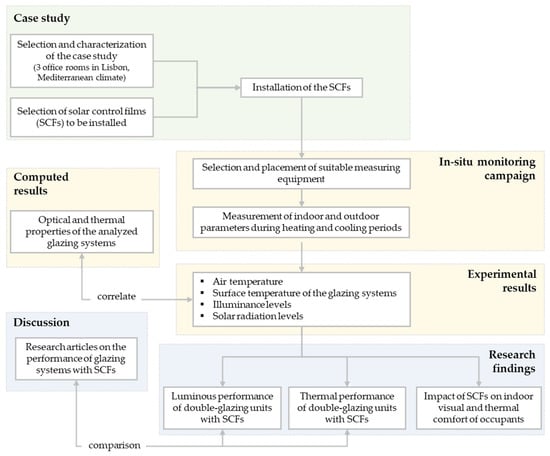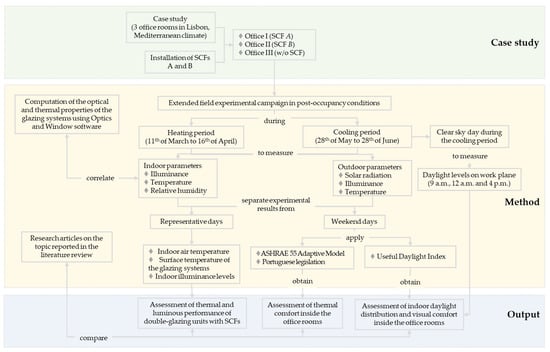 The present study aims to pursue the research on this subject and help to fill some gaps that still exist in experimental research on the evaluation of the thermal and luminous performances of window films in the Mediterranean climate. An experimental integral evaluation approach is proposed involving thermal and luminous performances and visual and thermal indoor comfort conditions assessment in office rooms with glazing systems with and without SCFs, in the city of Lisbon (coordinates: 38°7′ N, −9°1′ W). The research proposed in the present study is illustrated in Figure 1.