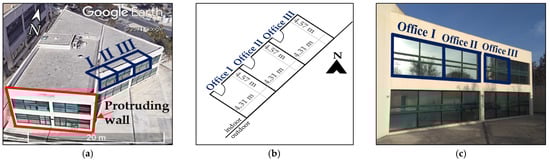 Office rooms used as case study: (a) identification in dark blue of the location of the three office rooms in the university building (Google Earth 2021); (b) dimensions (length and width) of the office rooms; (c) location (in dark blue) of the glazing systems of the office rooms on the exterior façade (oriented southeast).
