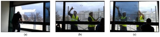 Internal view of the removal of the existent solar control film (SCF) and installation of the new SCF in office I: (a) removal of the existing SCF B (internally applied on the glazing); (b) cleaning works of the external glass surface of the glazing; (c) installation of SCF A on the glazing (external glass surface).