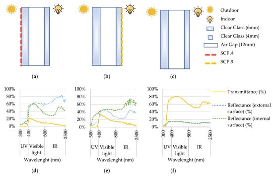 Figure 5a–c shows the configuration of the glazing systems during the experimental campaign. For comparison purposes, office III that does not have a solar control film installed on its glazing system is taken as the reference office. Figure 5d–f shows the transmittance and the front and back reflectance of the glazing values in the ultraviolet (UV), visible and infrared (IR) radiation wavelengths of the solar spectrum for the three glazing systems, computed using Optics software. The reduction in solar radiation transmittance can be observed in the presence of the SCFs comparing with the reference glazing (Figure 5f) full-spectrum results. Comparing with the original glazing (without an SCF), the solar radiation reflectance increases in the presence of the SCFs, mainly on the surface they are installed on, according to Figure 5d,e.