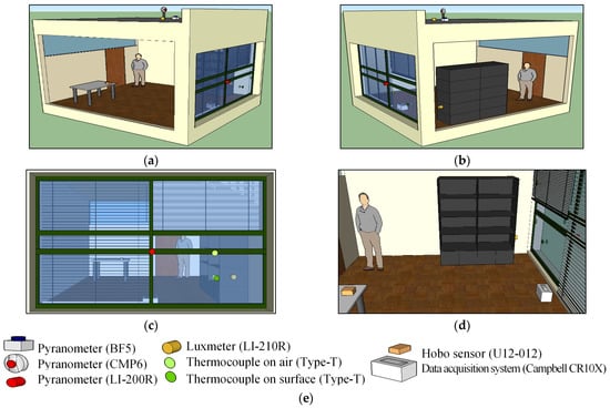 Figure 7 shows photos of the experimental equipment that were captured during the experimental campaign. The Venetian blinds of the offices were kept at the same position during the experimental data measuring periods (Figure 7f).