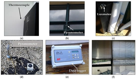 Equipment used during the experimental campaign: (a) type-T thermocouple located at the side of the closet (office III) to measure the indoor air temperature; (b) LI-200R pyranometer located at the façade of office III to measure the outdoor solar radiation on the vertical plane (normal to the façade); (c) LI-210R luxmeter located at the side of the closet (office III) to measure the indoor illuminance levels on the vertical plane (normal to the glazing system); (d) CMP6 (left) and BF5 (right) pyranometers located at the top floor to measure the outdoor solar radiation on the vertical (normal to the façade) and horizontal (normal to the top floor) planes, respectively; (e) DL2 data logger used for the data acquisition in office II; (f) position of the shading system during the experimental campaign.