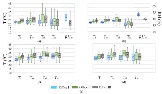Experimental results of the hygrothermal performance of the offices based on data of working hours (between 9 a.m. and 6 p.m.) from days when the variable refrigerant volume (VRV) unit was turned on (weekdays—(a,c)) and off (weekends—b,d) in the heating (a,b) and cooling (c,d) periods, using a color legend (e): indoor air temperature, ; shading slats surface temperature, ; internal glass surface temperature, ; external glass surface temperature, ; relative humidity, .