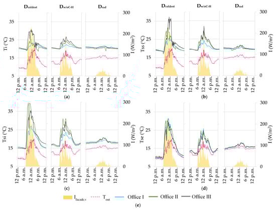 The outdoor () and indoor () air temperatures, internal () and external () glazing system surface temperatures and Venetian blinds slats () surface temperature along with the incident solar radiation on the vertical plane during the representative days are shown in Figure 9. Even though Dcoldest has the lowest minimum outdoor air temperature values, it shows the highest indoor temperature values measured during working hours due to the high outdoor solar radiation levels. The recorded temperatures for Drad were similar between offices due to the low outdoor levels of solar radiation and outdoor air temperature values being practically constant when comparing with the other two representative days.