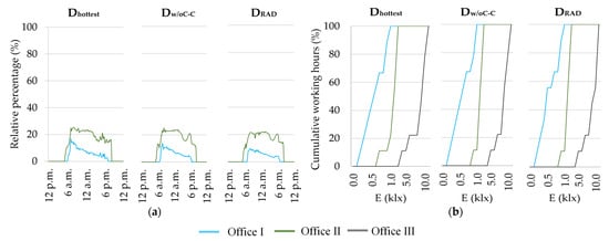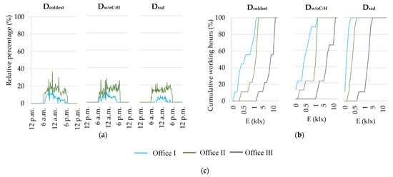 Figure 10 shows the cumulative frequency of working hours (between 9 a.m. and 6 p.m.) with less than specific indoor illuminance levels (on the vertical plane) during the representative days of the heating period. The offices with SCFs have significantly lower indoor illuminance levels, particularly office I with the highly reflective solar control film A that made it possible to obtain average hourly illuminance levels of 0.7, 0.5 and 0.1 klx during the working hours of the Dcoldest, Dw/oC-H and Drad representative days, respectively. Average indoor illuminance levels of 1.6, 1.0 and 0.3 klx were obtained for office II, during working hours of the Dcoldest, Dw/oC-H and Drad representative days, respectively. The highest hourly illuminance peak values were measured in the reference office (Dcoldest—14.1 klx, Dw/oC-H—11.1 klx, and Drad—4.3 klx). During 50% of the working hours, indoor illuminance levels are lower than 0.55, 1.8 and 8.8 klx in offices I, II and III, respectively, during the Dcoldest representative day. The indoor illuminance levels are lower than 0.09, 0.37 and 2.7 klx in offices I, II and III, respectively, during 50% of the working hours of the Drad representative day that has the lowest outdoor solar radiation levels (overcast sky).