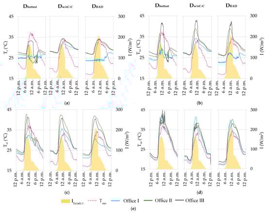 Figure 11 shows the outdoor () and indoor () air temperatures, internal () and external () glazing system surface temperatures and Venetian blinds slats () surface temperature along with the incident solar radiation on the vertical plane on the representative days of the cooling period. Even though Dhottest has the highest outdoor air temperature values, it does not show the highest indoor temperature values measured during working hours due to the VRV unit operation. Dw/oC-C and DRAD show similar measured temperatures for the three offices, excluding the VRV unit operating hours.