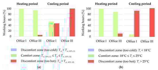 - Office I had 100% of working hours within thermal comfort during the heating period. The presence of SCF A increased the percentage of working hours within thermal comfort during the cooling period, making it possible to obtain thermal comfort during 53% and 9% of the working hours (which corresponds to an increase of 53% and 9% of working hours within thermal comfort when compared with office III), in accordance with the ASHRAE 55 80% acceptability class [] and Portuguese legislation [,,], respectively.