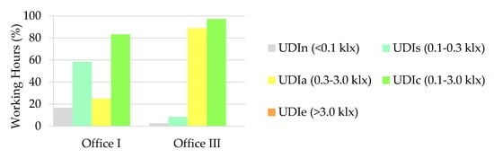 The illuminance levels measured at the desks of offices I and III on the horizontal plane during the weekends of the heating period were grouped into the UDI metric ranges [] and then the percentage of working hours with these specific ranges was computed in order to assess the indoor visual comfort. The following UDI metric ranges were considered: UDIn—non-sufficient illuminance levels (lower than 0.1 klx); UDIs—supplementary artificial lighting is probably needed to perform visual tasks (between 0.1 and 0.3 klx); UDIa—autonomous illuminance levels without artificial lighting to perform visual tasks (between 0.3 and 3.0 klx); UDIc—useful illuminance levels as the sole source or combined with artificial lighting (between 0.1 and 3.0 klx); UDIe—excessive illuminance levels that can potentially cause overheating and/or glare (higher than 3.0 lx).