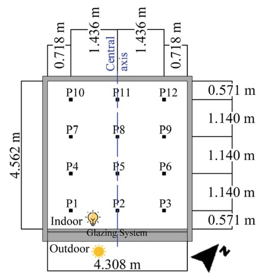 The indoor illuminance levels measured on the work plane (located at 0.7 m above the floor) during a clear sky day of the cooling period were taken in offices I and III (without an SCF) at the following hours: 9 a.m., 12 a.m. and 4 p.m. The location of the measuring points (12 in total), equal in the two offices, is shown in Figure 15.