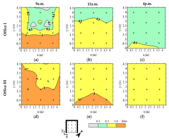 The shading effect on the exterior façade, caused by the protruding wall of the building of the case study, decreased the illuminance levels measured inside the offices at 12 a.m. (Figure 16b). Office I presents lower levels of indoor illuminance when comparing with the reference office (office III), having supplementary illuminance levels in about 25% of the floor area distant from the glazing system. Illuminance values higher than 3.0 klx, possible to cause glare, were measured in office III (without an SCF) in the area closest to the window and between 0.3 and 3.0 klx (UDIa) in the rest of the office area, due to the high visible transmittance of its glazing system.
