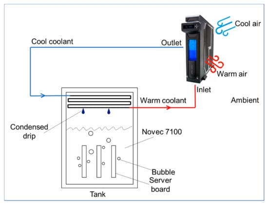 A novel, innovative cooling structure and procedure of a two-phase immersion cooling system were established for the cooling of ICT devices. The scheme of the proposed two-phase cooling system is shown in Figure 1, which includes a primary heat exchanger and a tank with coolant and server boards as ICT devices. The ambient air temperature was maintained at 21–23 °C.