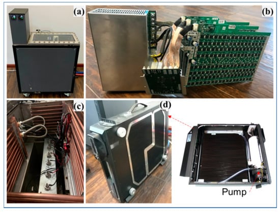 Figure 2a shows the tank where real servers were submerged in the dielectric liquid Novec 7100 supplied by 3M (Minnesota Mining and Manufacturing, Saint Paul, MN, USA) [41]. The dielectric liquid, being expensive, was filled in the tank only to submerge all the servers (Figure 2c) during the experiments. For each experiment, the server power output was maintained at a constant level. As the surface temperature of the servers rose and reached the boiling point of Novec 7100, the surrounding liquid formed bubbles and absorbed heat through evaporation. The produced vapor gathered on the top of the tank, where condenser coils were placed around the wall, as shown in Figure 2c. The heat was transferred from the vapor to the cold coolant circulating inside the condenser coils and was removed from the tank. Thereafter, the vapor condensed into the fluid phase and dripped back onto the liquid bath because of gravity. The heated coolant inside the coil released heat to the environment by a primary heat exchanger, as shown in Figure 2d.