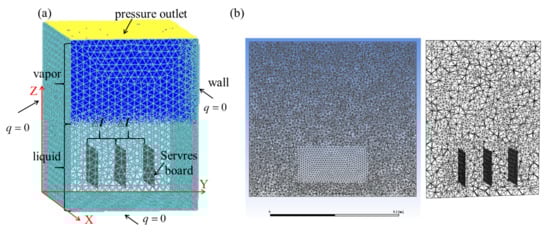 Building physical models is the first step in running a CFD simulation. The dimensions of the simulated two-phase cooling tank are the same as those used in the experimental study, which is 650 × 450 × 1050 mm3 (L × W × H), as demonstrated in Figure 3. Figure 3b shows the mesh distribution near the server board, which was locally encrypted. The walls of the tank were set as adiabatic, and three server boards were placed under a 50 mm liquid bath, with the dimensions of each board at 235 × 182 × 8 mm3 (L × W × H). There are 140 CPUs on each board, and each CPU has dimensions of 8 × 8 × 1 mm3. During the simulation, the boundary conditions of the servers were set as constant heat flow, which was consistent with the server power output. There are some assumptions and simplifications in this model. The server boards, including printed circuit boards and CPUs (covered with phenolic epoxy resin), were treated as an entire heating plate covered with phenolic epoxy resin (thermal conductivity of 2.2 W/m K). The coolant-side cooling equipment and heat transfer process were removed from the simulation, and the top of the tank was considered as a pressure outlet. The assumption was that all the heat from the vapor could be fully released to the environment by the heat exchanger. These simplifications were applied because this simulation focused on the heat transfer between the submerged servers and the liquid but not on the entire system. The grid chosen in this study was “Tet/Hybrid,” which consisted of tetrahedrons and other hybrid elements. One of the limitations of the model is that the detail of the CPU was ignored.