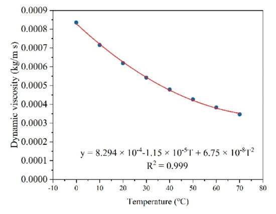The thermodynamic properties of the liquid and vapor were obtained from the Novec 7100 manual [41]. Each thermodynamic parameter was approximated by temperature-dependent polynomial functions. Figure 4 and Figure 5 provide two examples that show the correlations between the temperature and the liquid dynamic viscosity/vapor conductive coefficient. Table A2 in Appendix A lists all the temperature-dependent properties of the thermodynamic parameters used in Fluent.
