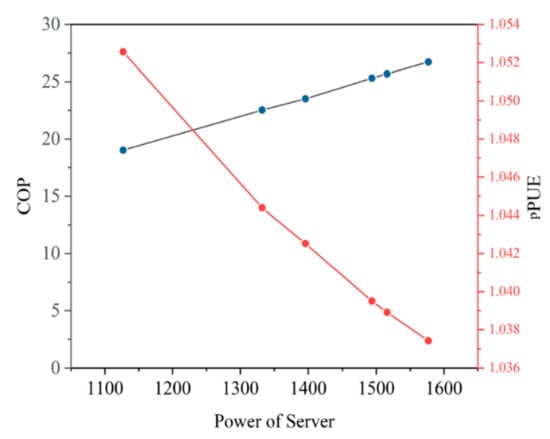 Table 6 lists the power outputs of servers and the “fan + pump” under six conditions. The server power varies between 1127 W and 1577 W, whereas the power of the “fan + pump” changed only a little because either the pump or the fan was set at the same level under these conditions. Figure 6 shows the results of COP and pPUE calculated from the experimental study. COP ranges from 19.0 to 26.7 and maintains an increasing trend, with the highest value, 26.7, obtained for a power of 1577 W. Meanwhile, pPUE ranges from 1.037 to 1.053 and indicates an opposite trend—the highest value is obtained at a power of 1127 W. The reason for the observed monotonous relationships is that the server power used in this study did not exceed the upper limit of the system cooling capacity. During the study, the power of the fan and water pump was maintained stable at approximately 59.0 W. This allowed the external heat exchanger to release the heat dissipated by the servers efficiently. Thus, there remains the potential for a higher COP or lower pPUE if the server operates at higher power.