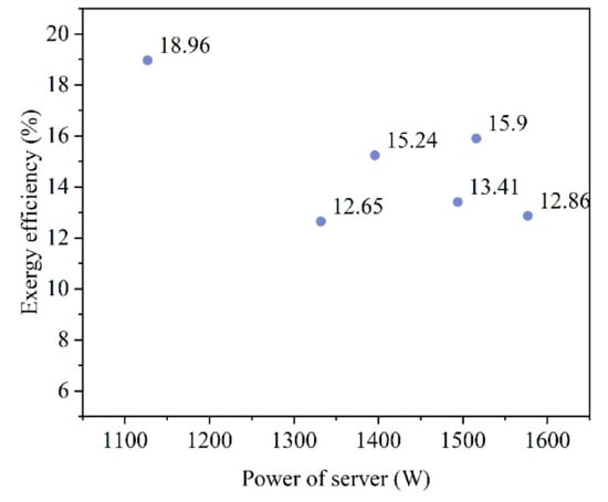 Table 6 lists enthalpy and entropy values of the media in the two-phase cooling system, which were used to calculate the exergy balance equations. The calculated destructions of exergy are presented in Table 7, and Figure 7 indicates the exergy efficiencies of the proposed two-phase cooling system under six experimental conditions. The exergy efficiency ranges from 12.65% to 18.96%, with an average of 14.84%. Kanbur [32] also analyzed exergy data from a two-phase cooling system and found the average exergy efficiency to vary from 7.9% to 18.9%. The differences between our study and that of Kanbur can be because the room temperature present during the operations in the study by Kanbur was 3–5 °C higher than that in ours. As stated in their study, the operating temperature can affect the heat transfer of the system and, therefore, influence the exergy efficiency. Díaz [52] computed the exergetic efficiency of a typical air-cooled system for data centers, finding an upper limit of approximately 12% for the exergetic efficiency, which was approximately 3% lower than the value in our study. Relatively less total power input can be one of the reasons for the higher exergy efficiency of the two-phase cooling system. In this cooling system, there is no chiller to cool the air; thus, no large fans are used to circulate the air. This results in notable energy and exergy savings, as previous studies have suggested that chillers account for a large part of energy consumption and exergy destruction in the air-cooled system [49]. In addition, the two-phase cooling system involves fewer instances of heat transfer, compared with that in the air-cooled cooling system, which also helps reduce exergy destruction induced by heat transfer. Another advantage of the two-phase cooling system is that it can produce high-quality waste heat, which can be further used to promote the energy efficiency of the entire system. Due to the high boiling point of the phase-changeable liquid (as high as 61 °C), the output temperature of the coolant leaving the tank can theoretically approximate 61 °C, which could lead to a high-quality stream of exergy. This type of waste energy can be directly used as a heat source to supply heat or produce cooling energy through an absorption refrigeration system. Meanwhile, for a typical air-cooled system in a data center, the hot aisle temperature is generally near 35 °C [53], which is relatively lower than that of the proposed two-phase cooling system, limiting the further reuse of its waste heat.