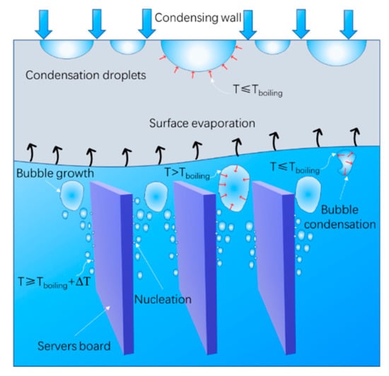 The liquid-cooled system requires the removal of high-density heat, which is too high to be removed by the air-cooled system; This heat is dissipated by high-performance information and communication technology (ICT) devices. Based on the direct contact of the liquid with the heat sources, the liquid-cooled system can be further categorized as direct cooling and indirect cooling. For direct liquid cooling, the dielectric liquid absorbs heat from the electronic components directly; this type of heat transfer can be highly effective [17,23]. Passive two-phase cooling is a fluid-cooled approach in which electronic components are submerged in a phase-changeable liquid bath in a closed box. When the surface temperature of the electronic components exceeds the evaporation temperature of the liquid, the process of boiling heat transfer is triggered, removing the extra heat in the form of vapor bubbles. The produced vapor rises up and further condenses through a water-based condenser installed above the bath. Finally, the heat is absorbed and removed by the coolant; the vapor is then liquefied and drips back to the bath, driven by gravity [24,25]. Compared with the air-cooled system, the two-phase cooling system could reduce the use of accessory equipment, such as chiller pumps and fans, potentially improving the energy efficiency of data centers. In addition, this system could avoid the surface temperature symmetry of electronic devices and guarantee their working environment.