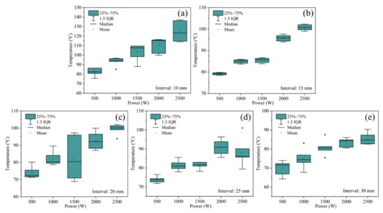 Figure 10 shows the predicted surface temperatures of the servers under different powers and interval settings. The power of the servers was set at five different levels, i.e., 500 W, 1000 W, 1500 W, 2000 W, and 2500 W. The interval between every two servers was ∆l, as shown in Figure 3, and set to 10 mm, 15 mm, 20 mm, 25 mm, and 30 mm. The box plots show distributions of the server surface temperatures, and different colors suggest values under different power levels. Generally, in a specific interval setting, a higher power rate leads to higher surface temperatures. For example, when servers were placed in an interval of 10 mm, the average surface temperatures under an output power of 2500 W were 14.0 °C, 21.3 °C, 31.3 °C, and 42.4 °C higher than the average surface temperatures under output powers of 2000 W, 1500 W, 1000 W, and 500 W, respectively. The same change trend can also be seen in the other four figures with different interval settings. This is because high powers bring more heat flux dissipated from servers to the liquid bath; if the space between the servers is too narrow, a mass of bubbles is produced, accumulating near the servers, and thus restricting the generation of new bubbles. Therefore, the cooling capacity of the liquid bath in a phase change may not be consistent with the output of the servers, causing an increase in the surface temperature. The results from CFD simulations indicate that widening the interval between the servers could help reduce the server temperature.
