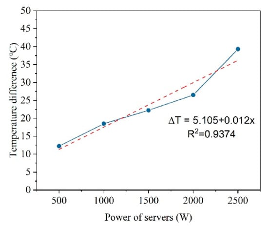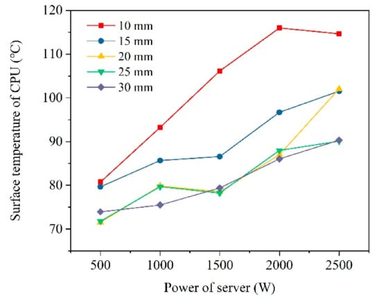 Figure 11 demonstrates the correlations between the server power and surface temperatures at various intervals. The surface temperatures shown in this figure came from the middle server because this server was highly affected by the adjacent servers and was thus more susceptible to the interval settings. Notably, the surface temperature of servers could significantly influence the working efficiency of CPUs, providing CPUs a suitable thermal environment to work under high-efficiency conditions. The surface temperature should not exceed 85 °C. In Figure 11, the dots indicate the simulated surface temperatures under five levels of power from 500 W to 2500 W, and the different interval settings are shown in different colors. Generally, higher power and smaller interval would lead to a higher surface temperature. An interval of 10 mm was found to be sufficiently large for servers with a power of 500 W to maintain the surface temperature below 85 °C. When the power was increased to 1000 W, an interval of 15 mm could overcome this limitation. For a power of 1500 W, the interval should be at least 20 mm. As the power is enhanced to 2000 W or 3000 W, even an interval of 30 mm is not sufficient to maintain the server surface temperature below 85 °C.