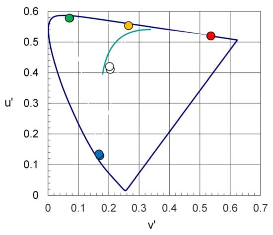 The CIE 1976 u’, v’ chromaticity coordinates of the LED color stimuli.