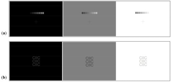 The assessment of visibility was conducted by evaluating the rating scale to understand the impact of afterimage on visibility. The low-contrast characters shown in Figure 5b appeared in 3 s at the center of the half-mirror as the stimulus was removed. The observers needed to estimate the visibility with a rating level from 1 (unclear) to 8 (clear). Similar to the duration time task, two GUI applications were individually applied to the experiment for color difference and visibility and to simulate the background with grayscale and characters.