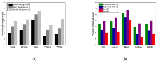 For visibility, the visual data were analyzed by ignoring the extreme data and averaging the observers’ evaluations. Referring to Figure 8a, the visibility rating level was obviously influenced by backgrounds and decreased with the darker one. As shown in Figure 8b, visibility is significantly reduced with longer exposure time and higher luminance. Furthermore, the higher luminance level showed more potent effects. Throughout the experiment, it was suggested that the positive afterimage seriously obstructed vision. When discussing the correlation coefficient r between the different backgrounds regarding the visibility, high r values in Table 8 were presented by the comparison and similar to the duration.