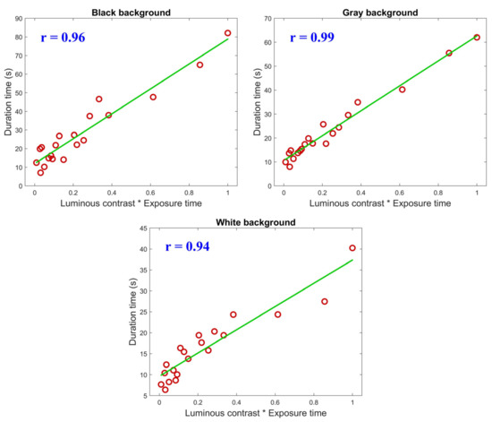 The relationship between the duration and the experimental parameters which contained the luminance levels, the background luminance and the exposure time, was investigated. The integral of the luminance contrast of background with the exposure time was regarded as the linear regression feature. It was normalized initially with the highest luminance under each background level. The visual afterimage duration (DT) was formulated as Equation (3), where Ls and Lb are the luminance of the test stimulus and background in units of candela per square meter, and te represents the exposure time of the stimulus in seconds. a0 and a1 are the coefficients equivalent to the linear function intercept and slope, respectively, and their values are listed in Table 9 for different backgrounds. The result of the linear regression model showed highly positive correlations between the prediction and the visual response, where the r values are 0.96 for black, 0.99 for gray, and 0.94 for white backgrounds, as shown in Figure 9.
