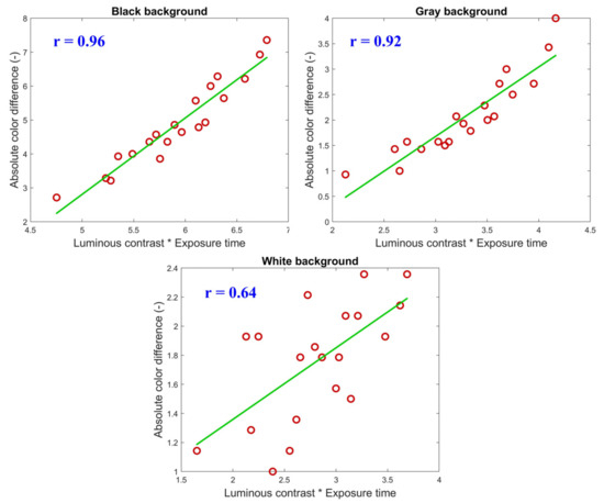 In discussing the color difference between the afterimage and the background, all visual rating data were first converted to the absolute values. The mean color difference of the afterimage with different backgrounds was analyzed with acceptable visual data which had passed the observer variability exam, as shown in Figure 7a. According to the stacked bar chart, the brighter background, especially when presented with higher luminous stimuli, significantly reduced the color difference. Moreover, the higher luminous stimuli enlarged the color difference perceived by the observers for all background conditions. The impacts of luminance and exposure times were compared, as shown in Figure 7b, where the luminance level produced much more influence on the color difference at 1 s. Furthermore, Table 7 shows the correlation coefficient between different backgrounds on the color difference, and lower correlation was found when compared to the visual response of the white background. However, the black and gray backgrounds were highly correlated with each other.