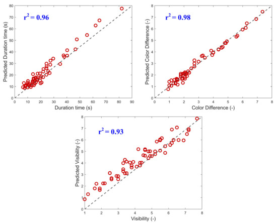 In the field of machine learning, the coefficient of determination (r2), root-mean-square error (RMSE), and mean absolute error (MAE), are mainly used to evaluate the machine learning model’s performance for a regression problem. The testing results are listed in Table 12, and Figure 12 shows the scatter plots of the predicted values and the ground-truth where the r2 scores are 0.96, 0.98 and 0.93 for the duration, color difference and visibility, respectively. Consequently, the third-order polynomial regression model can predict the duration, color difference and visibility with high R-squared, low RMSE and MAE values, which indicates a good fit.