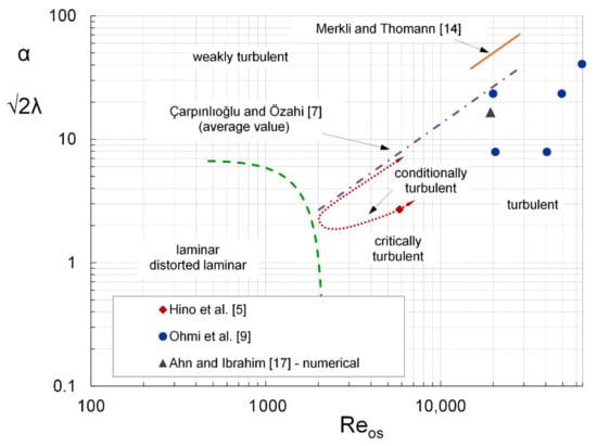 On the basis of their extensive review, Çarpınlıoğlu and Özahi [] concluded that the mean value of the constant k is 750 and is accurate to within 12%. Çarpınlıoğlu and Özahi [] calculated the average value of no less than seven investigations, namely, Segeev [], Hino et al. [], Ohmi et al. [], Ohmi and Iguchi [], Eckmann and Grotberg [], Akhavan et al. [], and Das and Arakeri []. Exceptions to this are the investigation of Merkli and Thomann [] and Zhao and Cheng [] who reported values between 380 and 400. Experiments at significantly higher Reynolds numbers (Reos = 220,000 at α = 75) were reported by Lodahl et al. [], who also considered a mean flow superimposed on the oscillations. Instead of imposing a harmonic bulk flow, Lodahl et al. [] imposed a harmonic centerline velocity for their experiments. The experiment of Hino et al. [] at Reos = 5830 and α = 2.70 (see Figure 1) is of particular interest because it shows both critically and conditionally turbulent regimes within the same experiment (see discussion in Section 3.1). As such, it can be considered to lie on the boundary between the two regimes.