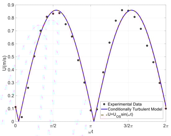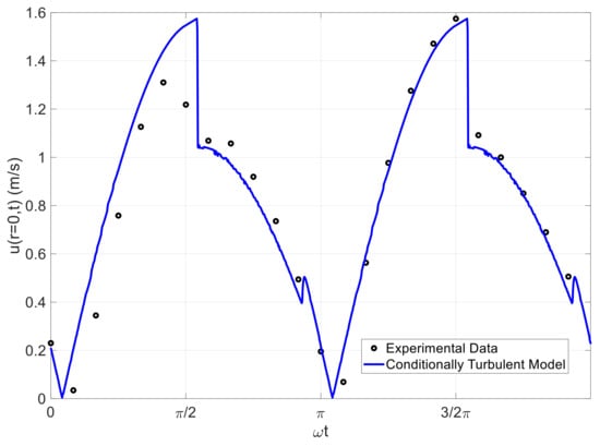 The challenge presented here was to render an appropriate model of each of the different flow regimes. The laminar regimes were straightforward; therefore, attention was focused on the conditionally turbulent and critically turbulent regimes (see Figure 1), and the turbulent state itself. In the conditionally turbulent flow, the transition occurs during the deceleration phase of the flow and when the oscillating Reynolds number exceeds its critical value; thus, two conditions must be fulfilled, namely, and . For the critically turbulent regime, transition occurs at supercritical Reynolds numbers during flow acceleration; thus, only the condition must be fulfilled. Finally, for fully turbulent flow or continuously turbulent flow, the flow is assumed to be continuously turbulent without transition or relaminarization. Due to the lack of a credible transition model in unsteady flows, we assume that transition occurs instantaneously. This can be considered as a simple heuristic model as it is consistent with experimental data [,]. Implementation of these models was achieved by “initiating” or “terminating” the mixing-length term, and hence the eddy viscosity described below.