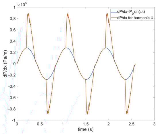 where and are constants (15 and −40, respectively). Furthermore, the dimensionless pressure gradient is calculated by solving the first-order lag equation:
