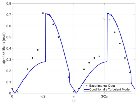 Figure 7 shows the corresponding data in the region close to the wall, at r/a = 14/15. Here, the prediction of a sharp increase in the near-wall velocity associated with transition, which is required to preserve conservation of mass, is qualitatively correct. As with the centerline velocity, however, it is not evident how accurately the timescales of transition are captured. The comparison with data in the acceleration phases of both half-cycles clearly shows the model deficiency in the laminar parts of the cycle. The significant under-prediction of the data is clear evidence that this flow is not purely laminar and contains some remnant turbulence generated earlier []. Note furthermore that the predictions in the initial part of the first acceleration phase are superior to those in the initial part of the second one. This may be due to differences in relaminarization following the different transition mechanisms, namely, critical and conditional.