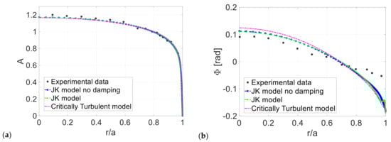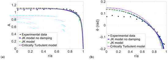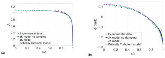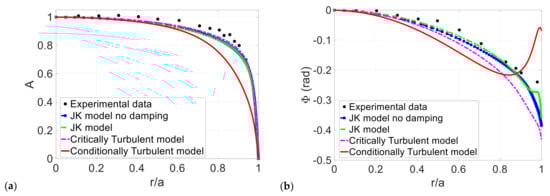 When data are presented in a phase-averaged manner, it is difficult to discern the mechanisms of transition and relaminarization, and indeed if they occur at all. Figure 8 presents the experimental data of Ohmi et al. [] (Case 2: Reos = 19,300, , see Table 1) with computational results of the various models including the Johnson–King (JK) model, with and without variable near-wall damping and critically and conditionally turbulent models. Note that this Reynolds number, the second-highest considered (see Table 1), is approximately 10 times larger than the accepted steady pipe flow value (~2000). Comparisons are shown for velocity amplitude ratio (Figure 8a) and phase shift (Figure 8b) as a function of the normalized pipe radius. For fully turbulent modeling, the flow is assumed to remain fully turbulent despite the fact that for part of the cycle the Reynolds number is subcritical. The physical justification of such a model is that the turbulence generated when the flow is supercritical does not decay sufficiently in the subcritical regime to warrant a transition or relaminarization model. For a flow oscillating in a quasi-steady manner, this would clearly not be the case. However, as the frequency is increased, such a scenario can be envisaged.