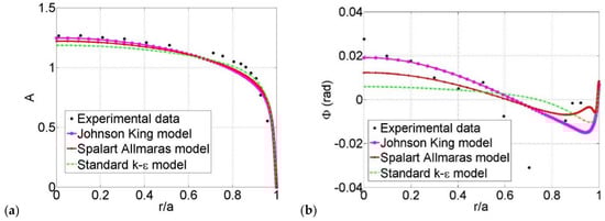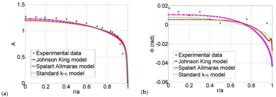 It was observed further that the results presented here were superior to the results of a standard k–ε turbulence model, particularly with regard to phase shift []. This may have been due to the fact that the standard k–ε model does not include a wall modification or a near-wall pressure gradient correction. Although the relatively simple Johnson–King model provided excellent correspondence with experimental data, popular and commonly used Spalart–Allmaras and k–ε turbulence models were assessed by means of the commercial software package Fluent, as described in Section 2.5. Cases 6 (Reos = 20,600, = 7.9) and 7 (Reos = 40,600, = 7.9) were selected for comparison.