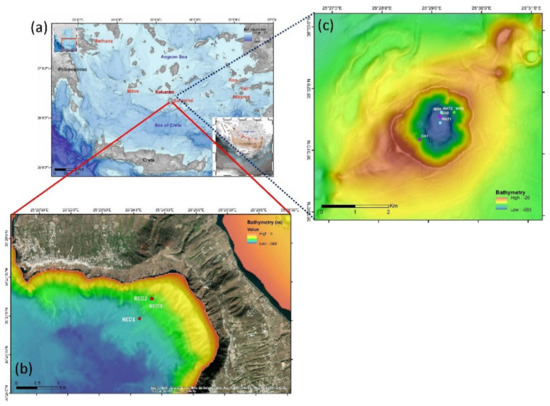 - Nomikou, P.; Carey, S.; Papanikolaou, D.; Croff Bell, K.; Sakellariou, D.; Alexandri, M.; Bejelou, K. Submarine Volcanoes of the Kolumbo volcanic zone NE of Santorini Caldera, Greece. Glob. Planet. Chang. 2012, 90–91, 135–151. [Google Scholar] [CrossRef]