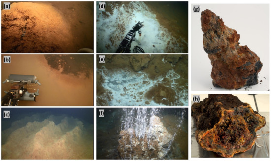 Photos of the samples used in metagenomics: (a) RED1; (b) RED2; (c) RED3; (d) WH1; (e) WH2; (f) WAT1; (g) CH1; (h) CH2. Underwater photos were taken by the cameras attached to the frame of the Remoted Operated Vehicle MaxRover of HCMR that was used for samples collection: