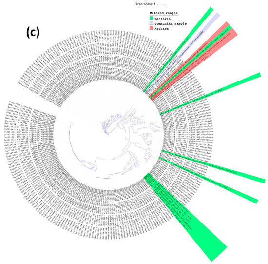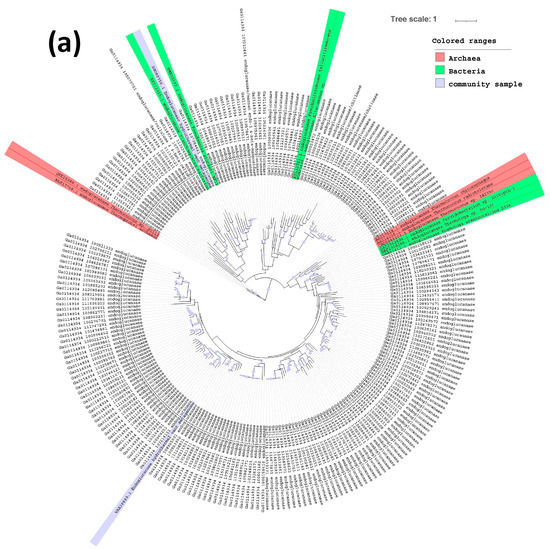 A total of 222 endoglucanases, 226 beta-glucosidases bglX and 216 alpha-galactosidases, melA and rafA, from the metagenome WH2 were selected for the construction of the phylogenetic trees. Putative amino acid sequences of these enzymes were extracted from the IMG/M database. A series of reference enzymes from the public database of Genbank—i.e., 14 endoglucanases, 17 beta-glucosidases bglX and 14 alpha-galactosidases melA and rafA from different microbial strains and metagenomes from hydrothermal vent sites were obtained and used for the tree constructions. Signal peptides were then identified and removed by using the software SignalIP (http://www.cbs.dtu.dk/services/SignalP/; accessed on 24 February 2021) [30]. Aligned and trimmed sequences were used to construct the phylogeny trees using both RAxML-NG (https://github.com/amkozlov/raxml-ng; accessed on 24 February 2021) [31] and IQ-TREE (http://www.iqtree.org/; accessed on 24 February 2021) [32]. The phylogenetic trees were bult with RAxML-NG using the model DEN and with IQ-TREE using the models LG+R5 for endoglucanases and WAG+R4 for alpha-galactosidases and beta-glucosidases. In the case of RAxML-NG, 1000 bootstrapped replicates were required; however, the algorithm converged after 900 bootstrap trees. Trees were visualized and obtained by using iTOL (https://itol.embl.de/upload.cgi; accessed on 24 February 2021) [33]. Both programs produced similar results and only the trees obtained by RAxML-NG are presented.
