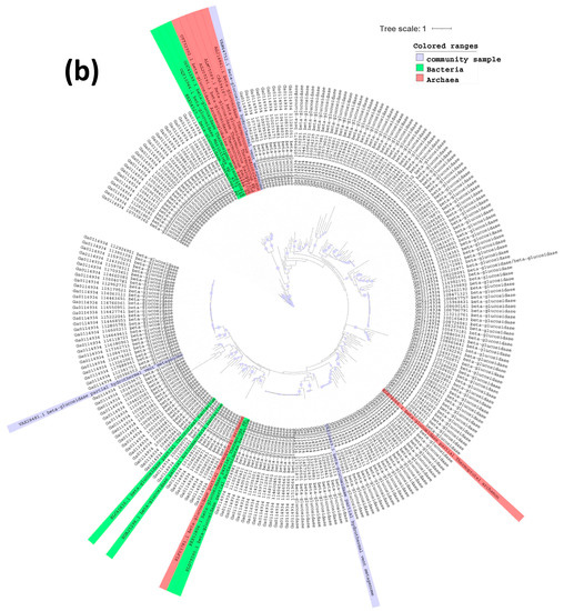 In addition to endoglucanases, beta-glucosidase genes with an EC number of 3.2.1.21 were also very abundant in almost all metagenomic libraries. The most abundant beta-glucosidase bglX, also known as periplasmic beta-glucosidase, can perform hydrolysis of terminal, nonreducing beta-D-glycosyl residues with release of beta-D-glucose. Beta-glucosidases are of great importance in industrial processes and they are mainly used for the enzymatic saccharification of cellulosic matrixes [45]. These enzymes are ubiquitous, occurring in organisms representing all domains of life from bacteria to highly evolved mammals. The Thermotoga species is an important source of hyperthermophilic glycosidases [46], whereas different Aspergillus species have also been studied as a source of glucosidases that can improve the efficiency of the saccharification step [47]. The phylogenetic analysis of beta-glucosidase amino acid sequences revealed the presence of diverse enzymes. A large number of different clusters were produced containing reference enzymes from both thermophilic bacterial and archaeal communities, as well as from metagenomic libraries from high-temperature environments (Figure 3b). These enzymes were most closely related to beta-glucosidases mined from metagenomes of the hydrothermal vent sediments in the hydrocarbon-rich Guayamas Basin [48,49] and to beta-glucosidase of the thermophilic Thermotoga sp. [48,49].
