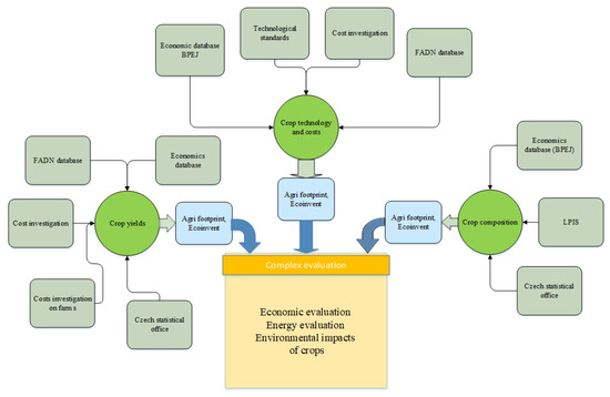 The current papers add more information on ESEU and thus offer a comprehensive picture of mutual inter-relationship of economic, energy and environmental aspects [36,37,38]. Figure 1 shows a comprehensive monitoring system based on available data, which are validated and specified against individual ESEUs. The diagram shows the sources for processing the economic and energy data of crop yields, technologies and their costs as well as the composition of crops, including links to the calculation of emissions from Agri-footprint data.