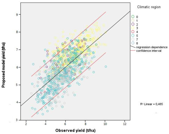 According to the identified functions, the yields were standardized to the remaining soil-climatic conditions. Subsequently, the proposed value of standard yields was validated with the current value of yields under the given conditions, and a new standardized value of yields was proposed for ESEU. A similar function such as the derivation of the yield (Relationship 3) was compiled by the dependence of nitrogen doses on soil-climatic influences.